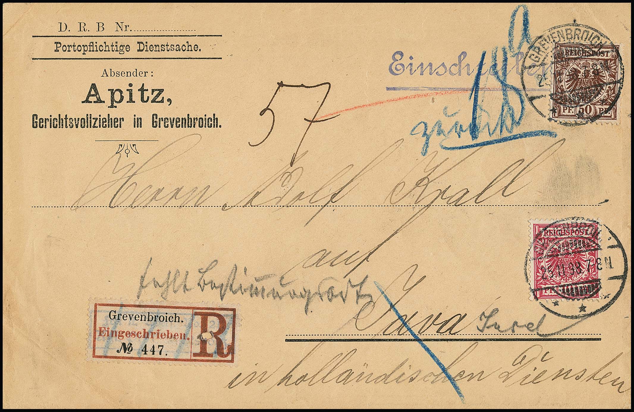 10 u. 50 Pfg. auf Gerichtsvollzieher-R-Brief von Grevenbroich nach Java und retour, 1898