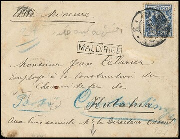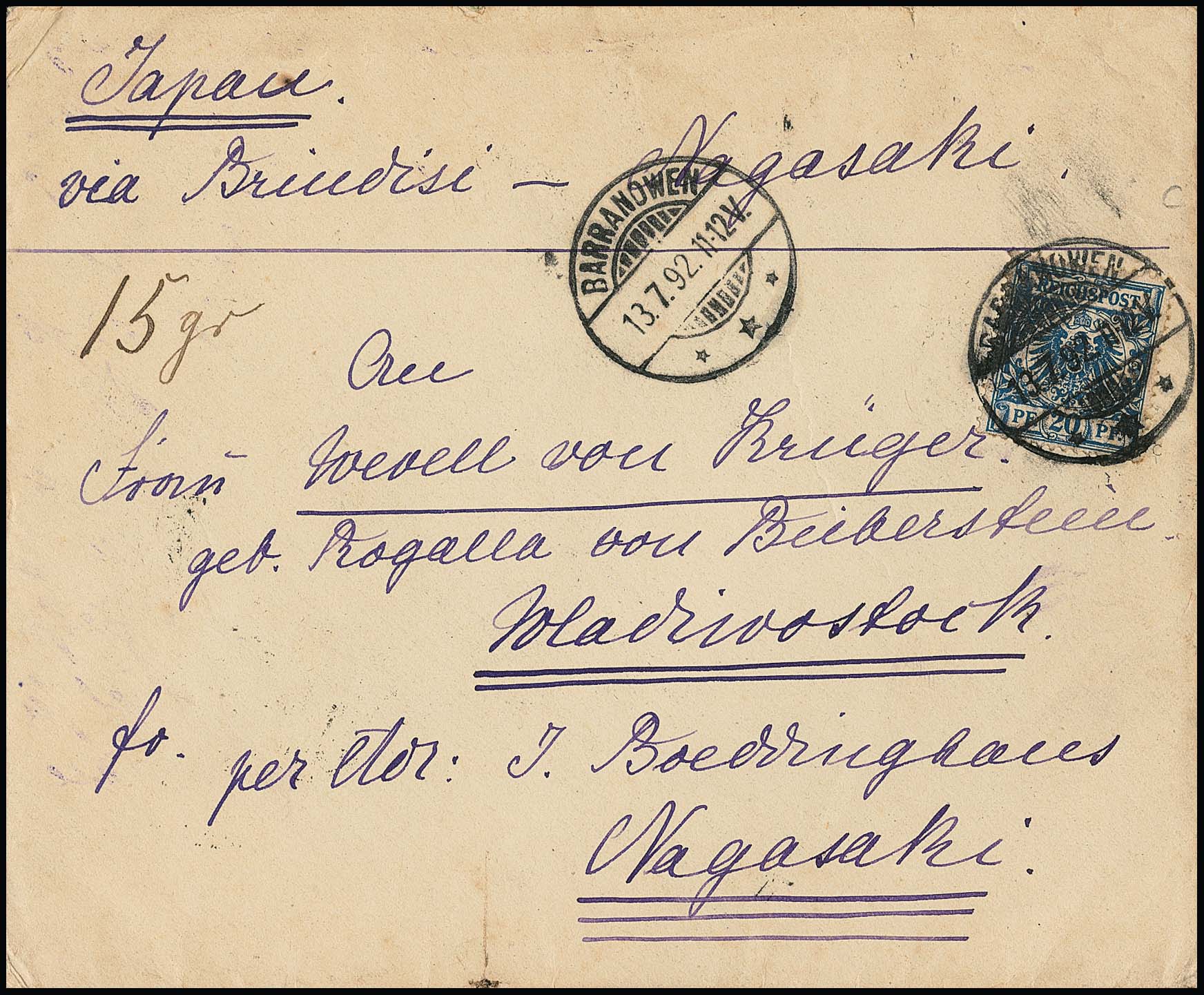 20 Pfg. kobaltblau einzeln auf Couvert (Gebrauchsspuren) von Barranowen 1892 über Singapur nach Nagasaki/Japan zur Weitersendung nach Wladiwostok, also eine äussert seltene Postverbindung! (Laufweg ca. 15.000 km!)