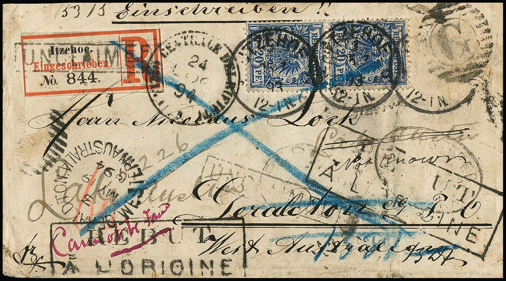 20 Pfg. per zwei (eine dritte Marke erkennbar auf dem Postwege abgefallen) auf R-Brief von Itzehoe 1894 nach Westaustralien und retour, Laufzeit über ein Jahr, dazu 2 und 3 Pfg. in MiF mit 5 und 10 Pfg. Germania auf Nachsendebrief nach Sydney und Kogarale/Australien