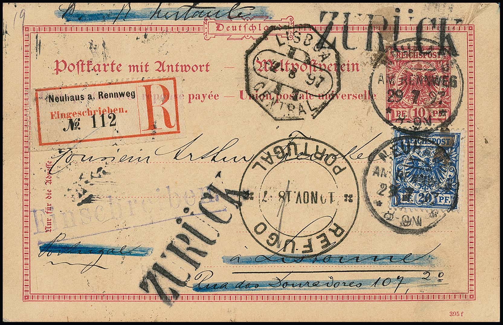 20 Pfg. auf Ganzsachenkarte 10 Pfg., von Neuhaus/Rennweg 1897 nach Portugal als R-Karte und retour. Dazu Ganzsachenkarte 10 Pfg. 1887 nach Lissabon, sowie 5 Pfg. auf 5 Pfg.-Karte 1893 nach Funchal/Madeira