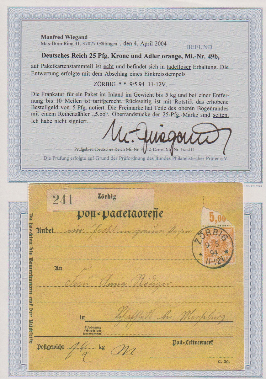 25 Pfg. mit Teil des Oberrandes ("5,00") einzeln, sowie per zwei als Mehrfach-Frankatur, auf zwei Inlands-Paketkarten, übliche Gebrauchsspuren, für EF Nr. 49b Fotoexp. Wiegand, dazu weitere EF Nr. 49b auf Orts-R-Brief von Leipzig nach Gohlis, sign. Jäschke-L.