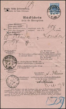 20 Pfg. als seltene Einzelfrankatur auf Auslands-Rückschein für einen R-Brief von Neustadt/Schwarzwald nach England und von dort zurück (Formular Rißchen)