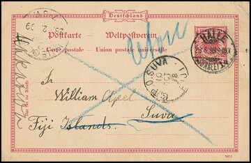 Ganzsachenkarte 10 Pfg. 1898 von Halle/S. nach Suva/Fidschi-Inseln mit vs. Ankunftsstempel, Karte typische leichte Gebrauchsspuren, aber sehr seltene Destination!