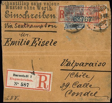 20 und 25 Pfg. auf Adreßteil einer Muster-ohne-Wert-Einschreibesendung von Darmstadt über New York nach Valparaiso/Chile, kl. Mgl., sowie 20 Pfg. einzeln auf Couvert nach Santiago/Chile