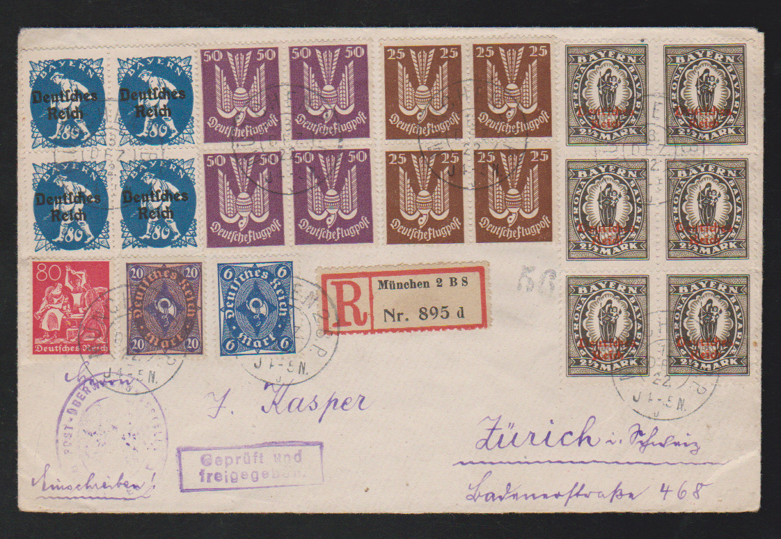 25 und 50 Pfg. Flugpost in Viererblöcken, nebst weiterer Frankatur, Nr. 128 (VB), 133I (Sechserbl.), 166, 207 und 228, auf Zensur-Auslands-Wertbrief von München, 13.12.22, in die Schweiz