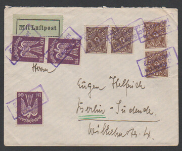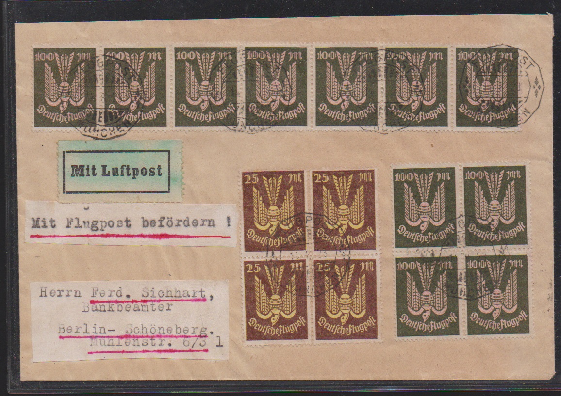 5 Mk. Flugpost Taube per sieben, nebst 25 Mk., sowie Nr. 235/36 je im Viererblock und 13mal Nr. 237, vs./rs. auf portoger. Lupobrief. Mi. lose gest. schon 650,- ++
