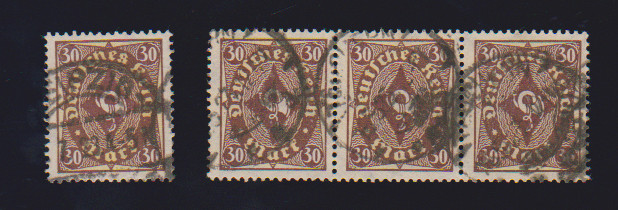 30 Mk. im Dreierstreifen, re. Marke Plattenfehler I, sowie auf Kartonpapier, je gest., sign. Infla, Peschl. Mi. 250,- +