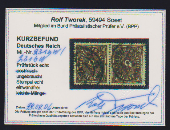 30 Mk. in guter Farbe und 40 Mk. je in waagerechten Paaren, sign. Infla bzw. Fotoexp. Tworek. Mi. 290,-
