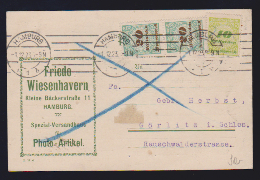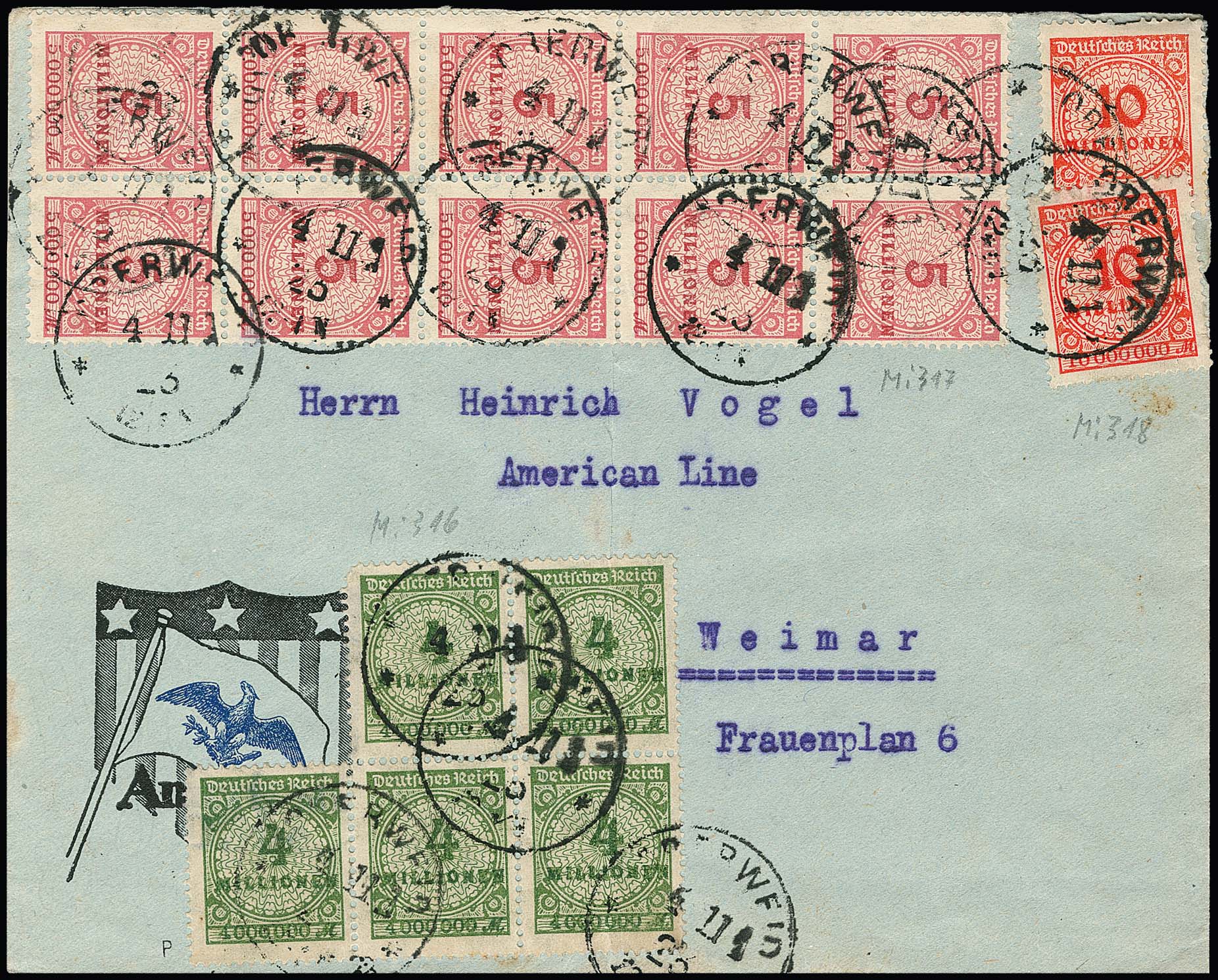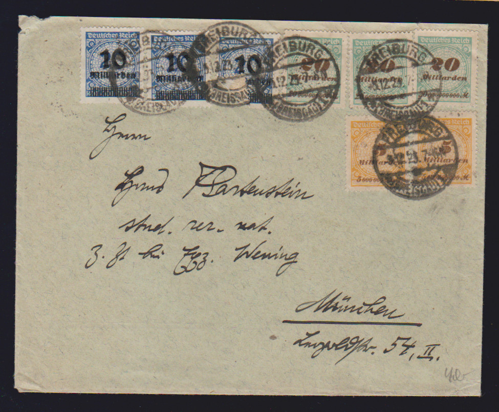 2 Mrd. Mk. Korbdeckel per 15 vs./rs. auf Drucksache, ferner Nr. 327(2), 329A(3) und 335A(3) auf Brief (eine 10 Milld. Mk. mit umgelegter Ecke entwertet), sowie Nr. 328 und Paar 329 auf Postkarte