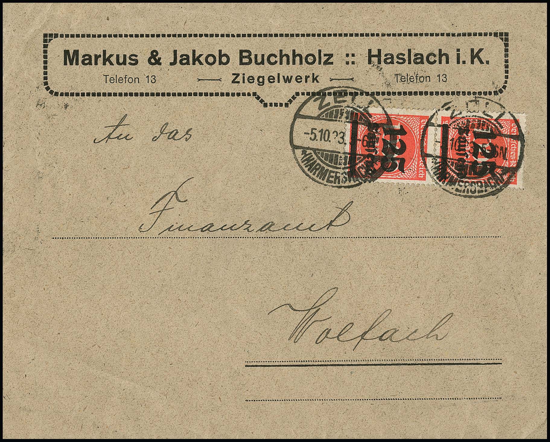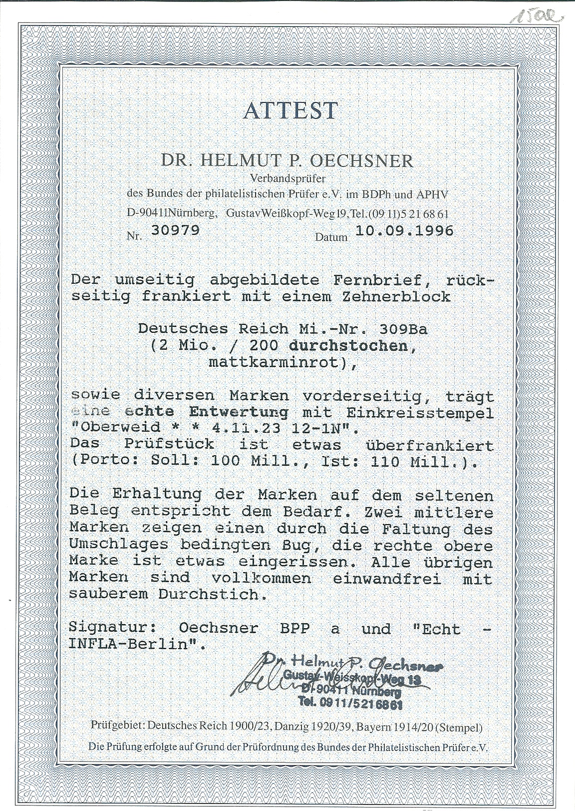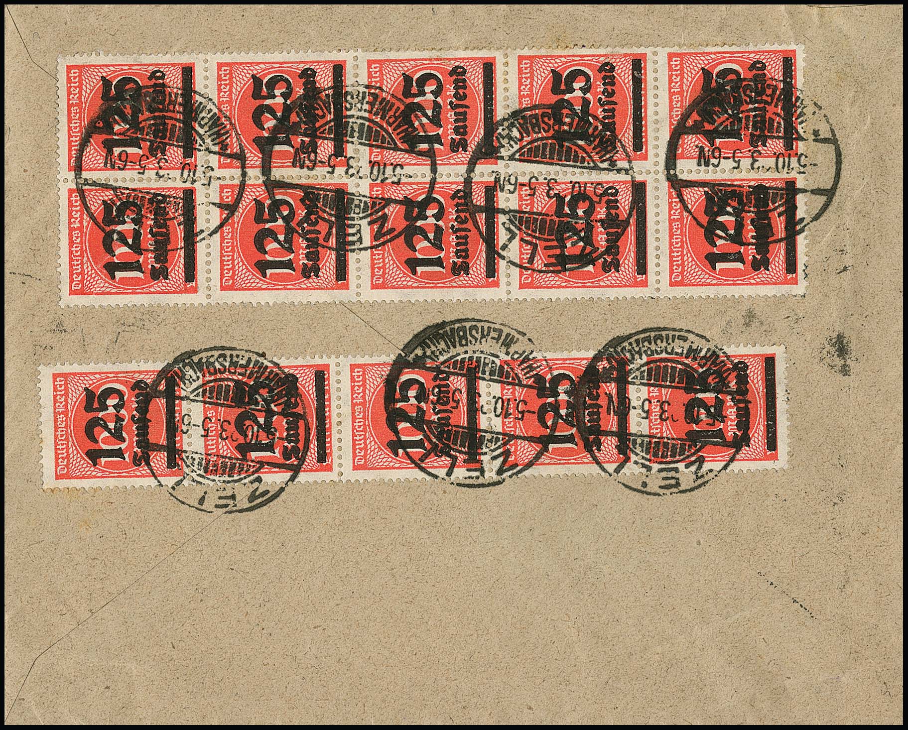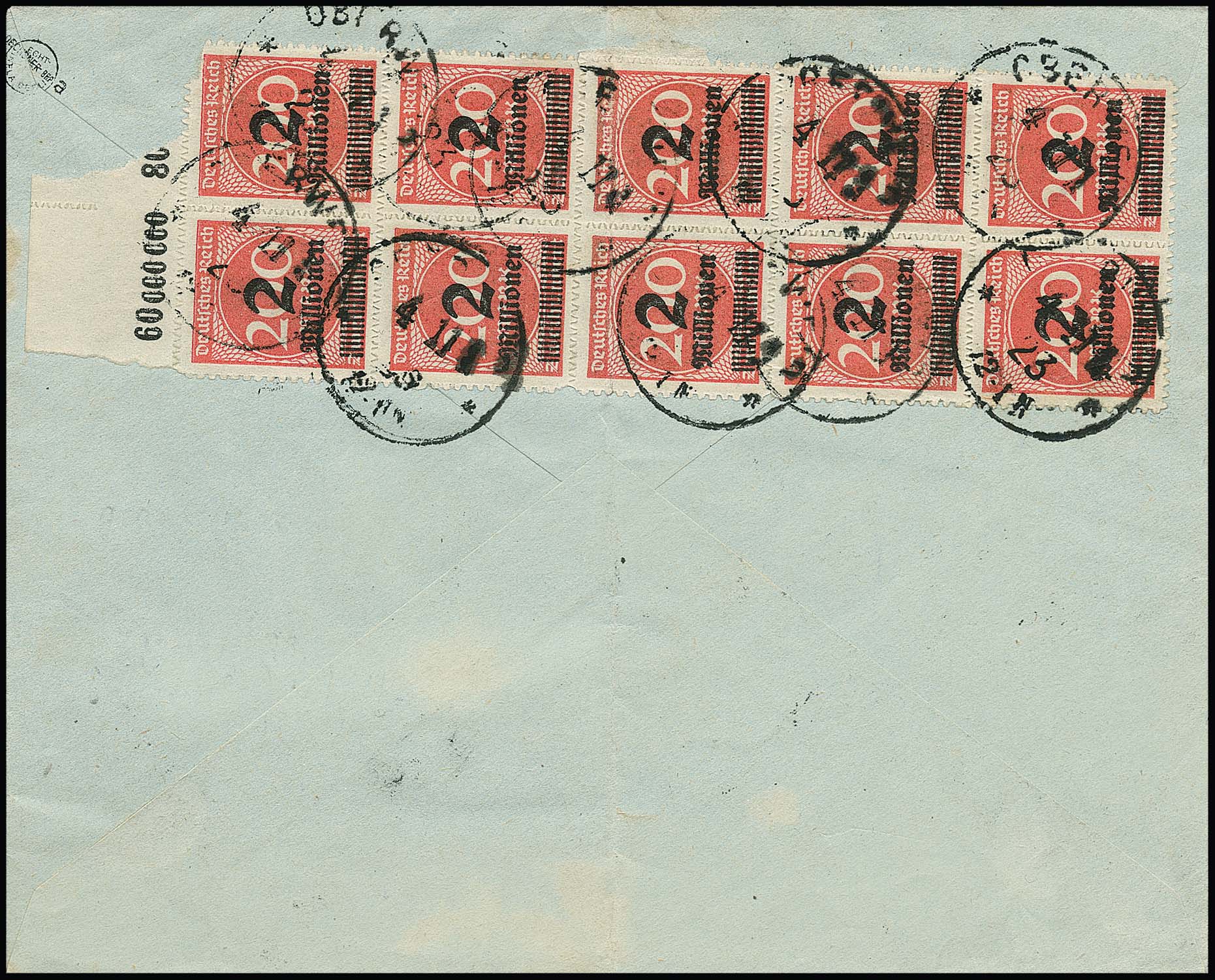 2 Mill. a. 200 Mk. durchstochen im Zehnerblock vom Oberrand rs., nebst vs. 4 Mill. (5), 5 Mill. (10) und 10 Mill. Mk. (2), auf Vordruckbrief von Oberweid nach Weimar. Durch den Brief geht ein Bug, davon sind auch die Marken (u.a. zwei Nr. 309Ba) betroffen, die rechte obere Marke des sehr seltenen Zehnerblocks kleine Fehlstelle, die linke mit sehr seltenem Platten-Oberrand (auf Brief ohne Bewertung), lose gest. schon 1300,-, Rest lose weitere 1800,- Mi. ++
