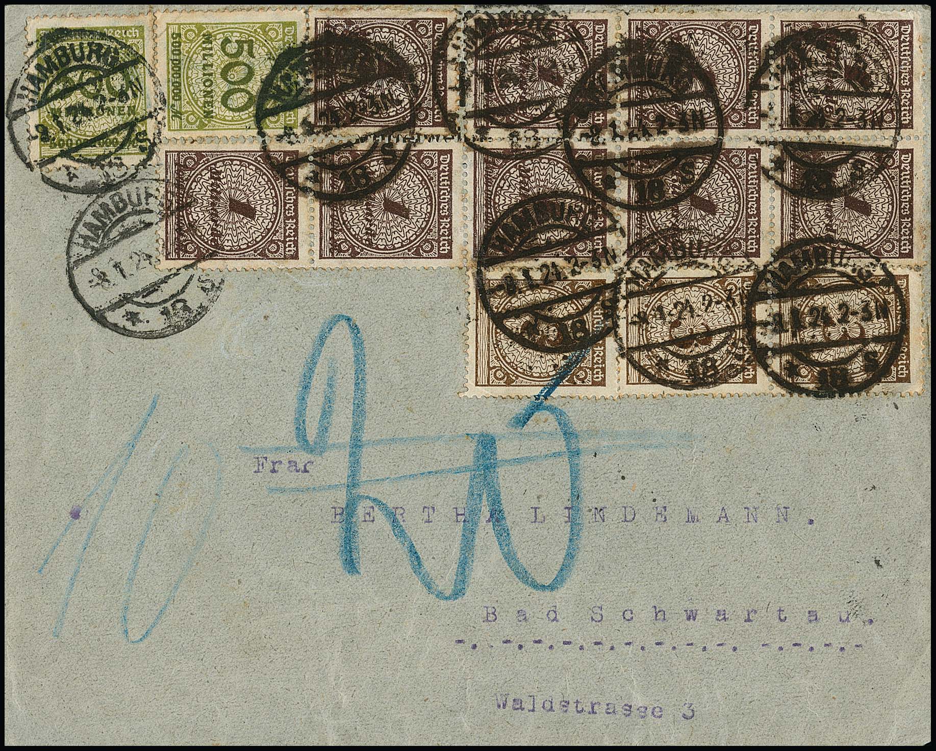 500 Mill. Mk. per zwei, nebst neunmal 1 Milld. Mk., in Mischfrankatur mit neuer Währung 3 Pfg. per drei auf um 10 Pfg. nachtaxiertem Brief (min. Gebrauchsmgl.) aus Hamburg, 8.1.24