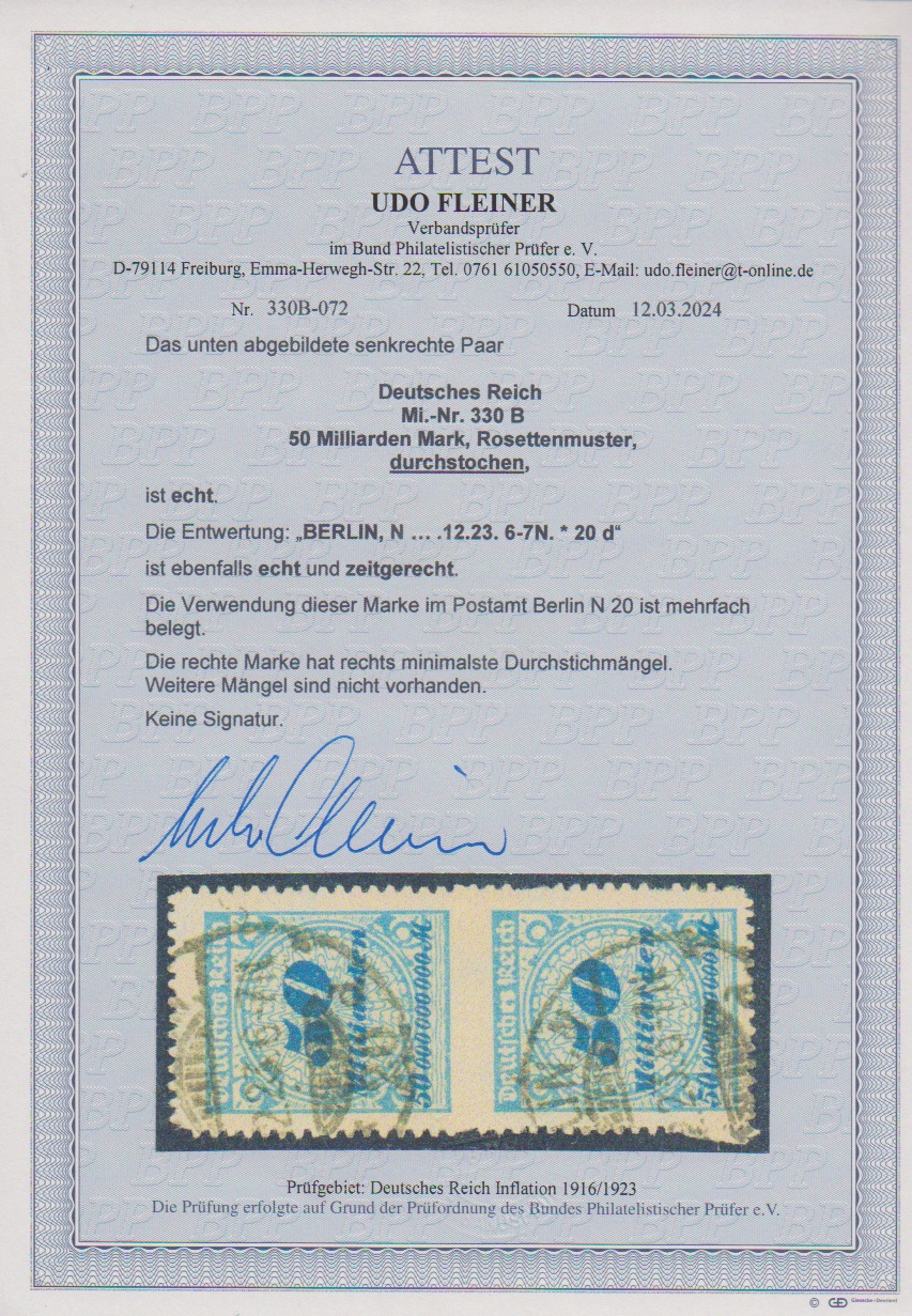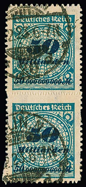 50 Milld. Mk. durchstochen, seltenes gestempeltes senkrechtes Paar, obere Marke vorzüglich erhalten, untere rechts zwei kurze Durchstich-Zungen, Attest Fleiner. Mi. 1800,-
