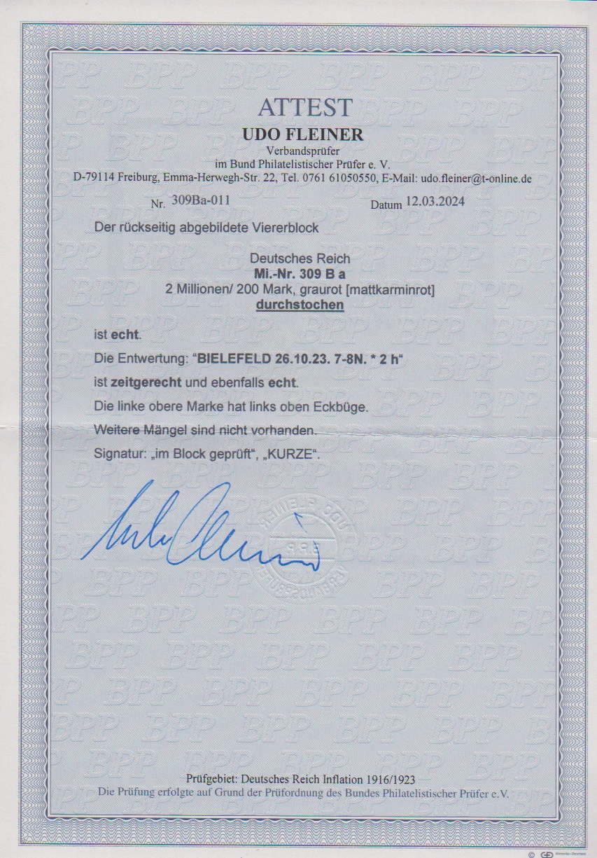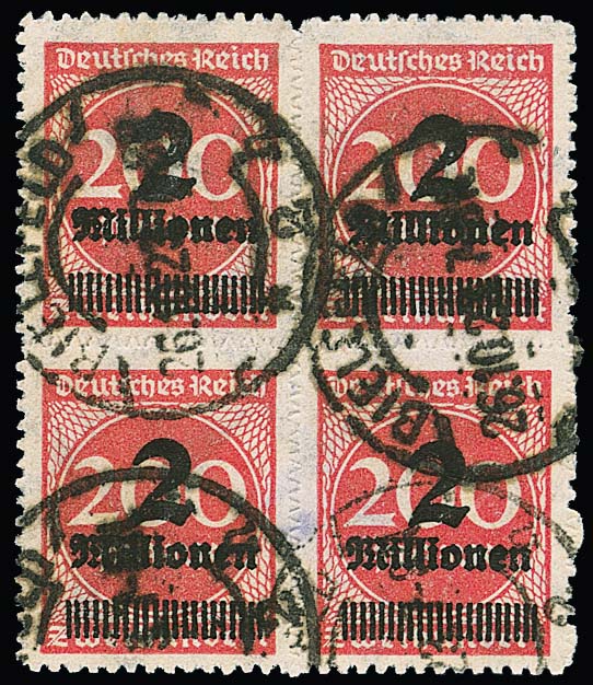 2 Mill. a. 200 Mk., durchstochen, im seltenen, sauber gestempeltem Viererblock, linke obere Marke minimal eckbügig, sonst gut. Sign. Kurze und Attest Fleiner. Mi. lose 800,- +