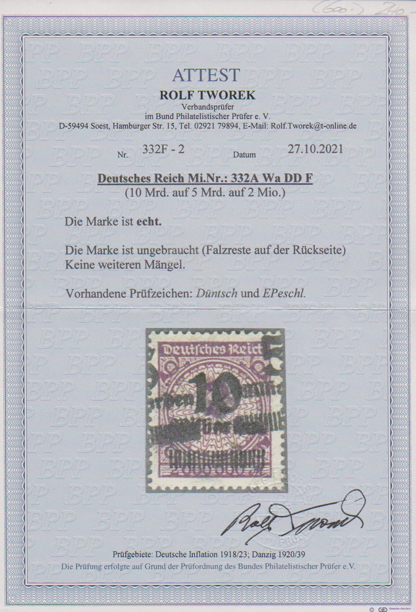 10 Milld. a. 5 Milld., seltener doppelter Aufdruck auf 2 Mio. Mk. tadellos ungebraucht, sign. Düntsch, Peschl sowie aktuelles Attest Tworek. Mi. 700,-
