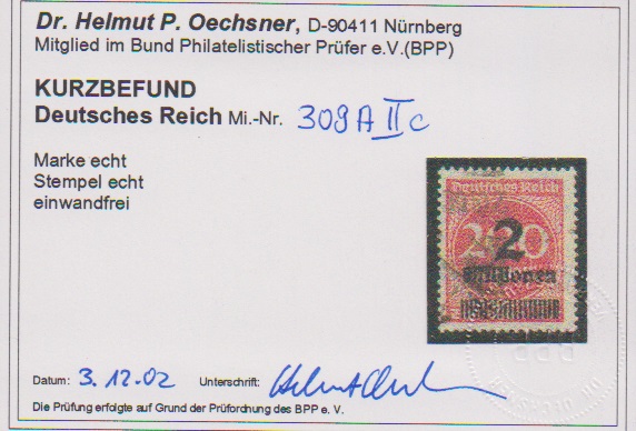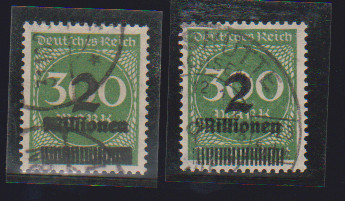 2 Mill. a. 300 Mk., zwei versch. Aufdruckfehler gestempelt, sign. Infla. Mi. 350,-