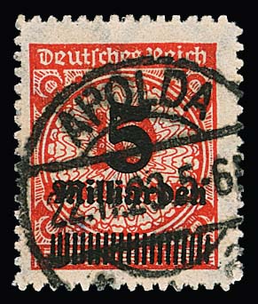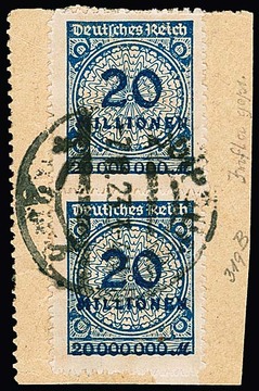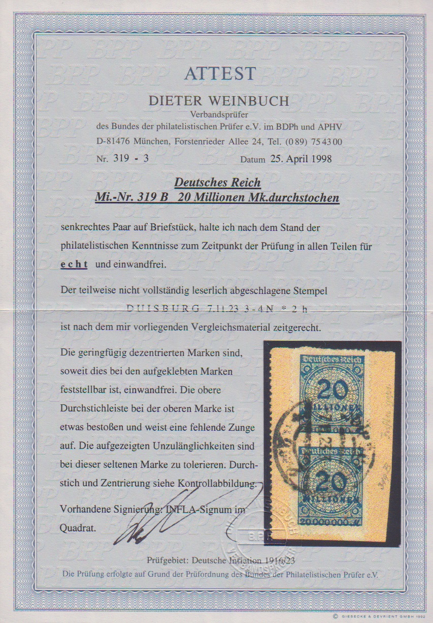 20 Mill. Mk. durchstochen, senkrechtes Paar auf Briefstück mit Rundstempel von Duisburg, oben Durchstich winzig bestoßen, belanglos. Attest Weinbuch "einwandfrei". Mi. 800,-