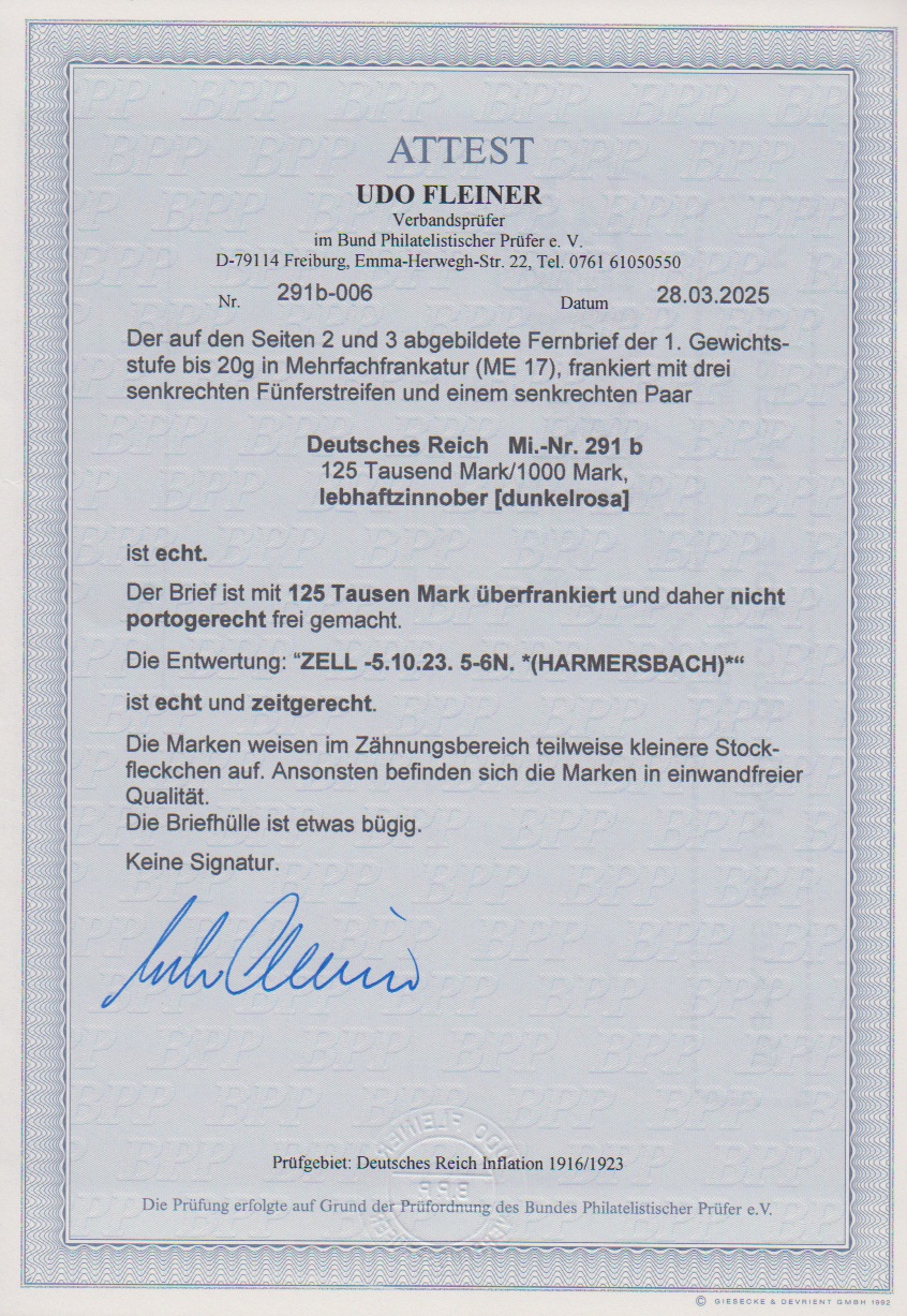 125 T. a. 1000 Mk. dunkelrosa per 17 vorder- und rückseitig auf überfrankiertem Brief von Zell/Harmersbach nach Wolfach, dabei Zehnerblock, wenige Marken getönte Zahnspitzen, mit dieser Marke seltene Massenfrankatur, Attest Fleiner