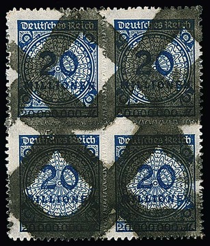 20 Mill. Mk., überdurchschnittlich gut durchstochener Viererblock mit typischem Grobsendungsstempel. Sign. Krause, Peschl, Infla. Mi. lose 1600,- +