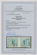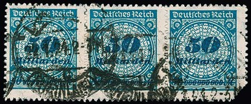 50 Milld. Mk. durchstochen, seltener gestempelter waagerechter Dreierstreifen, das linke Paar in guter Erhaltung, die rechte Marke sehr seltener Plattenfehler "HT", aber schräge Ecke. Mi. für Paar 1800,- + HT weitere 3000,-, sign. Peschl