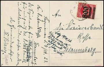 800 T. a. 200 Mk., OPD-Aufdruck von Königsberg (schwache Bugspur) einzeln auf hübscher Schnaps-Werbe-Postkarte aus Mehlsack/Ostpr., 9.10.23. Mi. 700,-, seltene EF, Attest Bauer