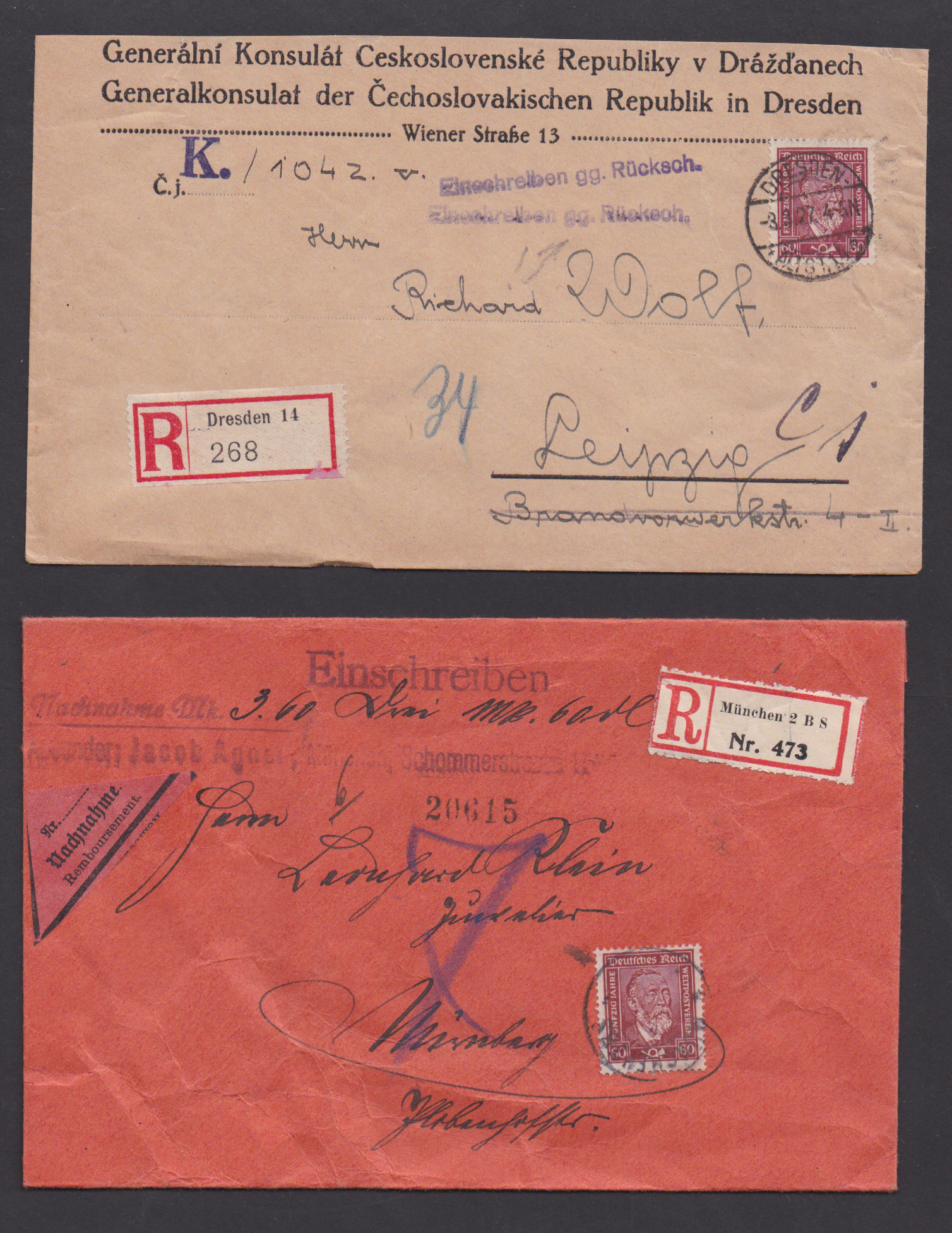 80 Pfg. Stephan, drei verschiedene Einzelfrankaturen: auf Wertbrief, auf Auslands-R-Brief, 3. Gewichtsstufe, sowie auf Auslands-Eilbrief, letztere beiden zum seltenen Sonderporto in die CSR