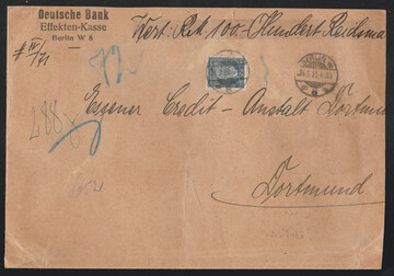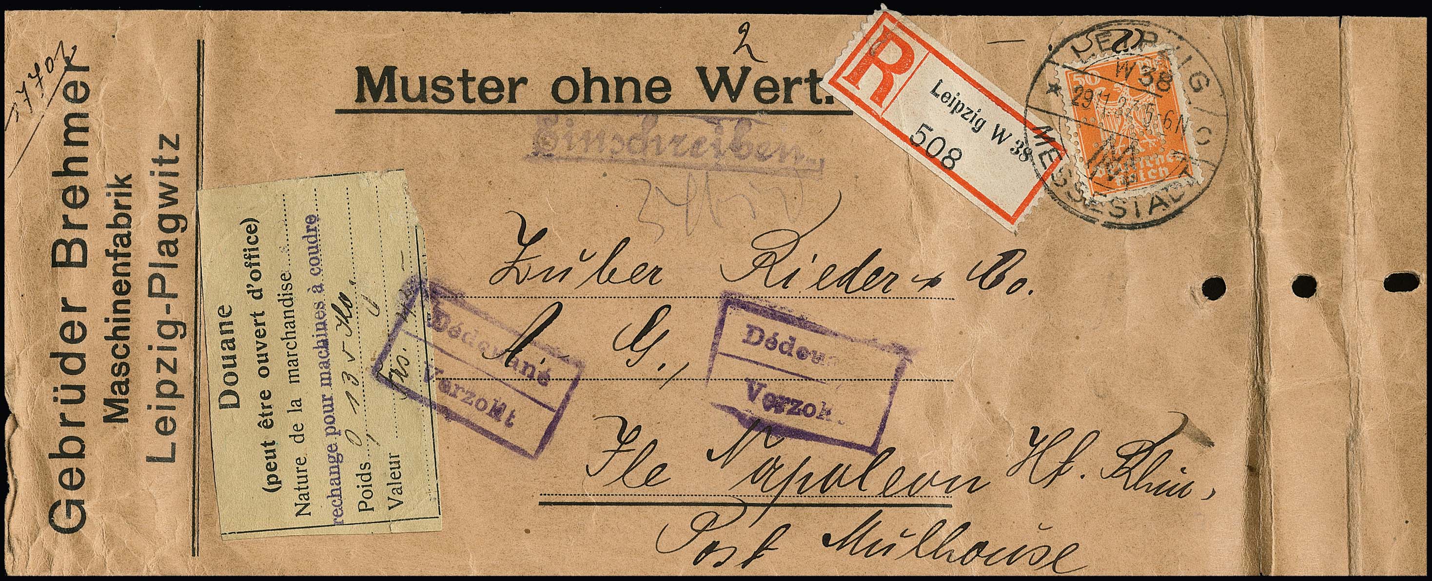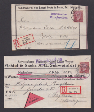 10 Pfg. Reichsadler auf Posteinlieferungsschein, sowie 50 Pfg. auf Auslands-R-Drucksache "Muster-ohne-Wert" mit Zensur (rs. französ. Portomarken), zwei seltene Einzelfrankatur-Varianten!