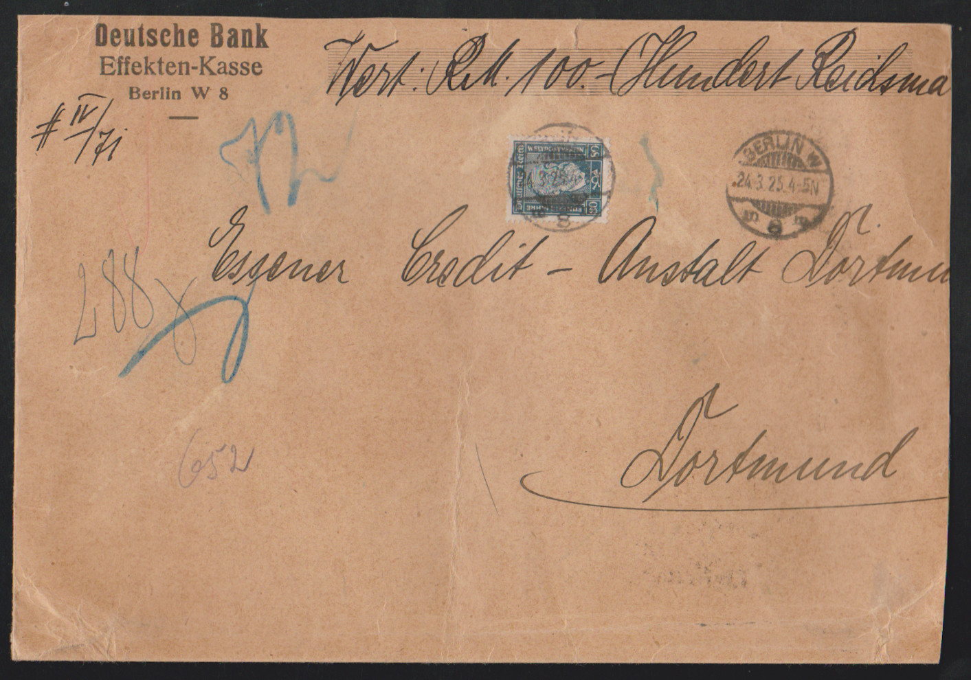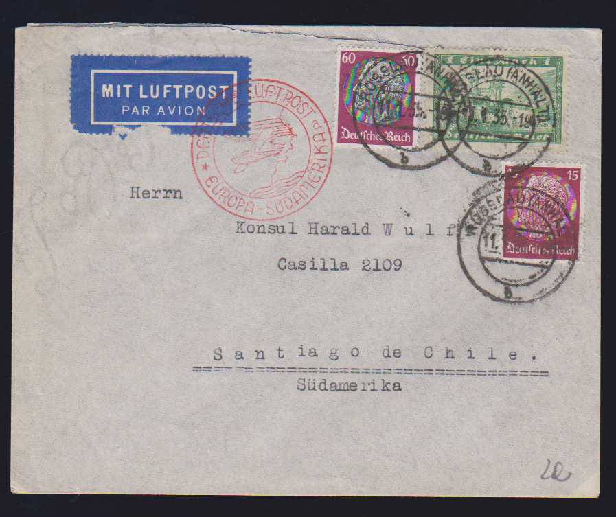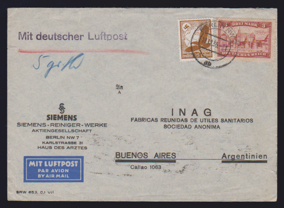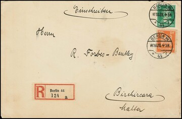1 Mk. Bauwerke (2) bzw. 3 Mk. Bauwerke je nebst weiterer Frankatur auf drei Briefen, einmal Eil-R-Brief gg. Rsch., zwei Übersee