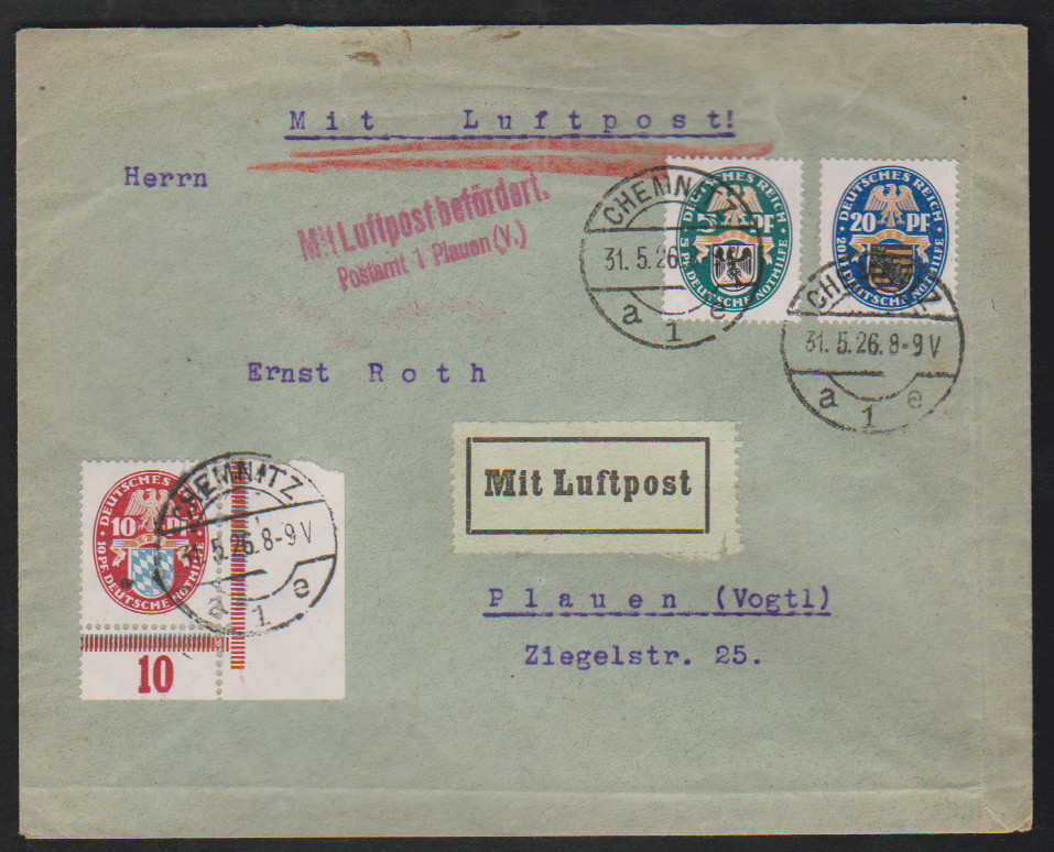 Nothilfe, vier gute Frankaturen: 10 Pfg. per vier als Mehrfach-Frankatur, ferner 20 Pfg. drei Einzelfrankaturen, auf Auslandsbrief 1926 von Zeitz zum Sonderporto in die CSR (selten, Brief leichter Mittelbug ausserhalb), sowie zwei Randstücke je einzeln auf Doppelbriefen