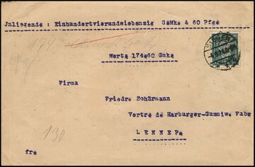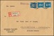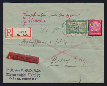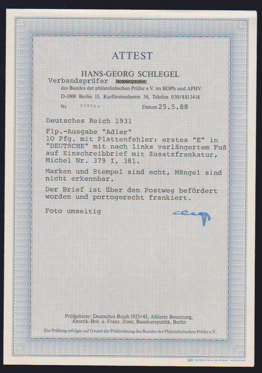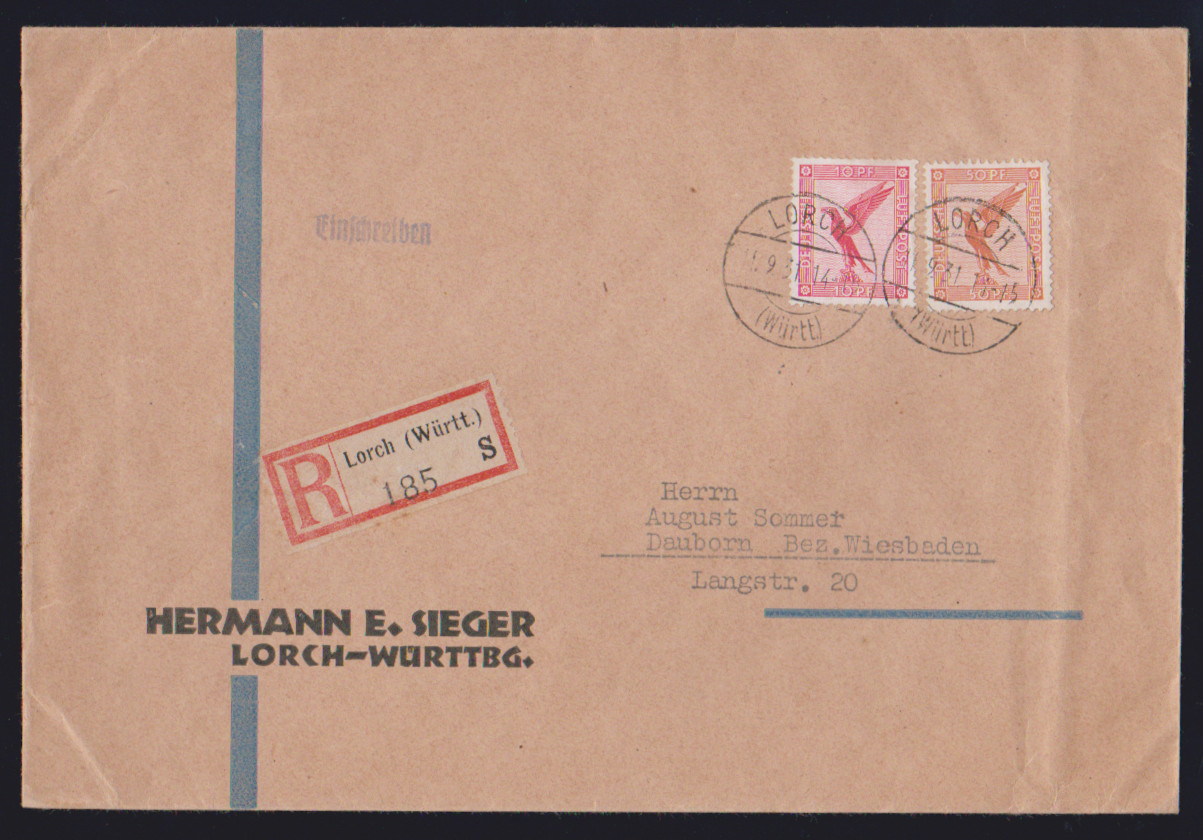 10 Pfg. Flugpost mit Plattenfehler I, nebst 50 Pfg., auf R-Brief, Attest Schlegel. Mi. 200,-