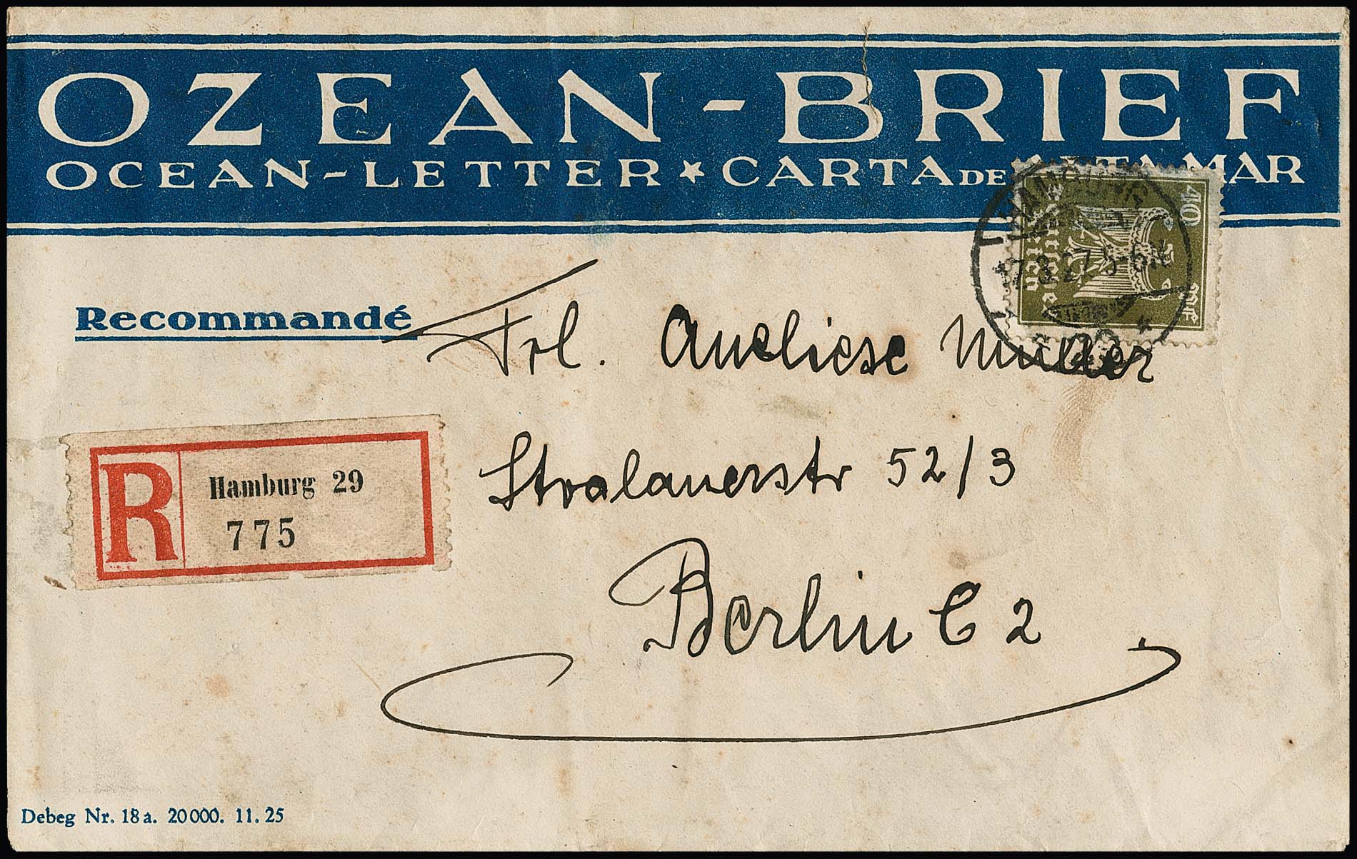 30 Pfg. Reichsadler einzeln auf seltenem eingeschriebenem blauem Telegramm-R-Couvert "Ozean-Brief" (etwas fleckig) mit zugehörigem Telegramm mit Ausfertigungstext "Äquator" (!)