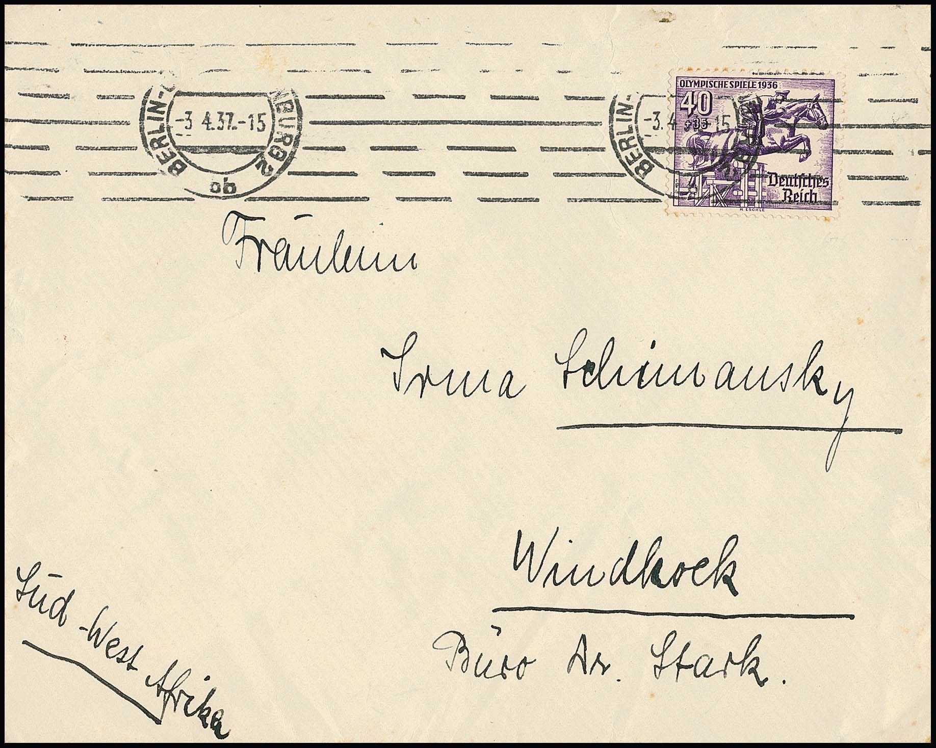 Sechs bessere portogerechte Einzelfrankaturen: Nr. 382 (Übersee-R-Brief), 391 (Auslands-Streifband), 470 (Drucksachen-Adresse über 100gr.), 558 (Postscheckbrief), 616 (Übersee-Doppelbrief nach Windhoek/Deutsch-Südwest) und Block 5 (R-Brief)