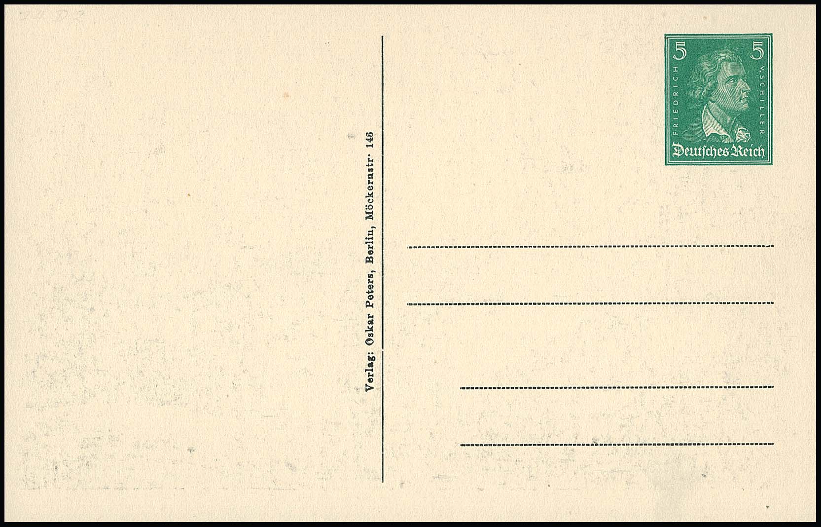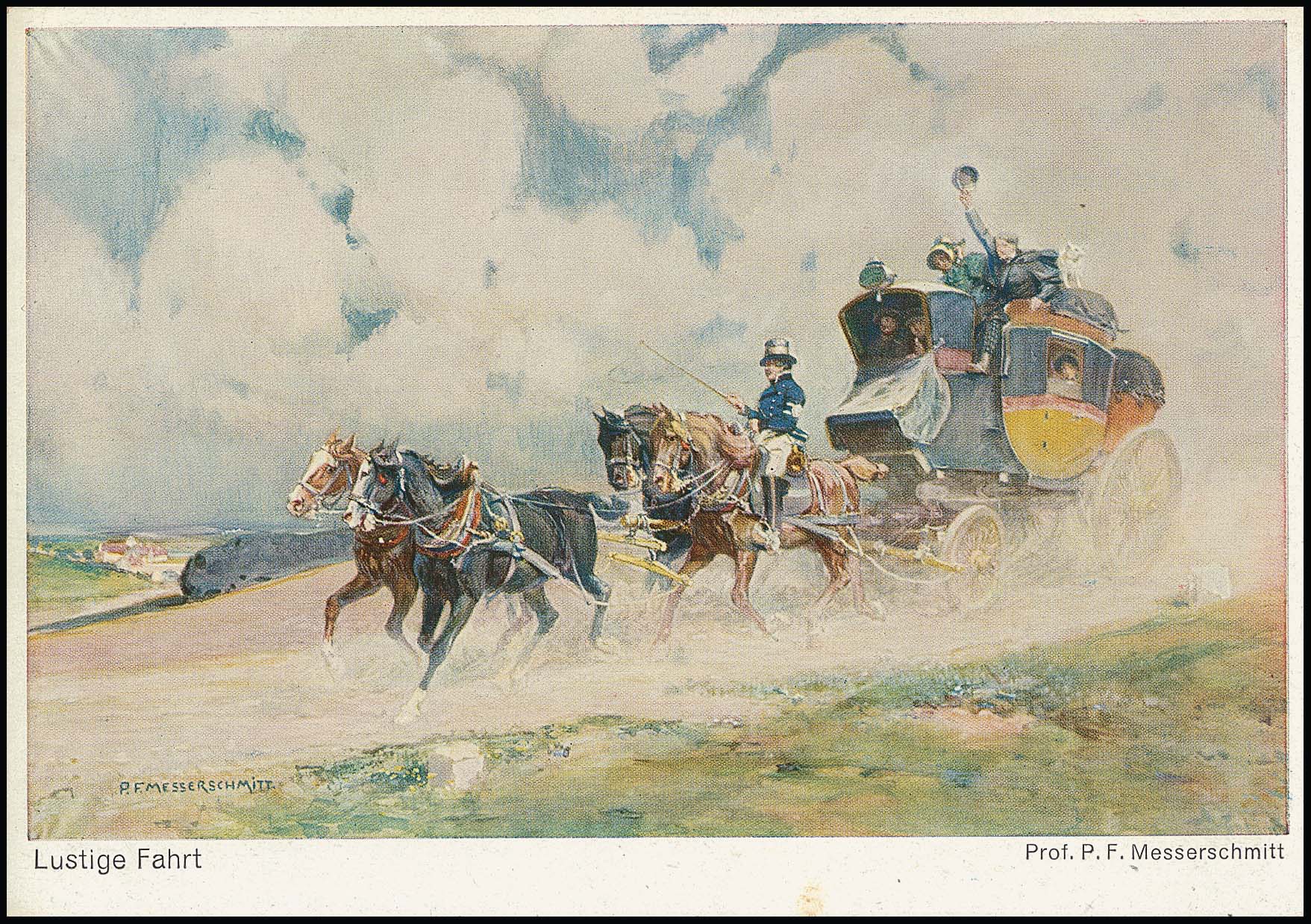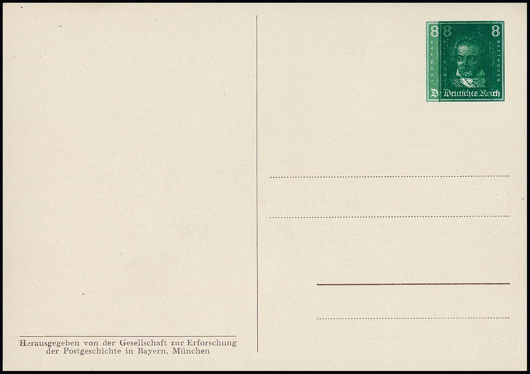 Privat-Ganzsachenkarte 8 Pfg. Beethoven, Color-Motiv "Lustige Fahrt" (Postkutsche) tadellos ungebraucht mit seltenem Doppeldruck des Wertstempels, siehe Foto