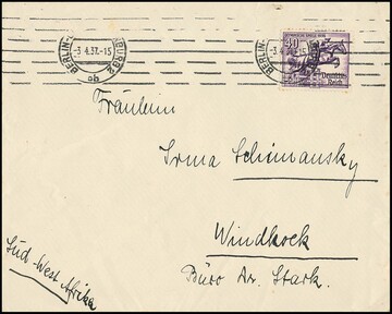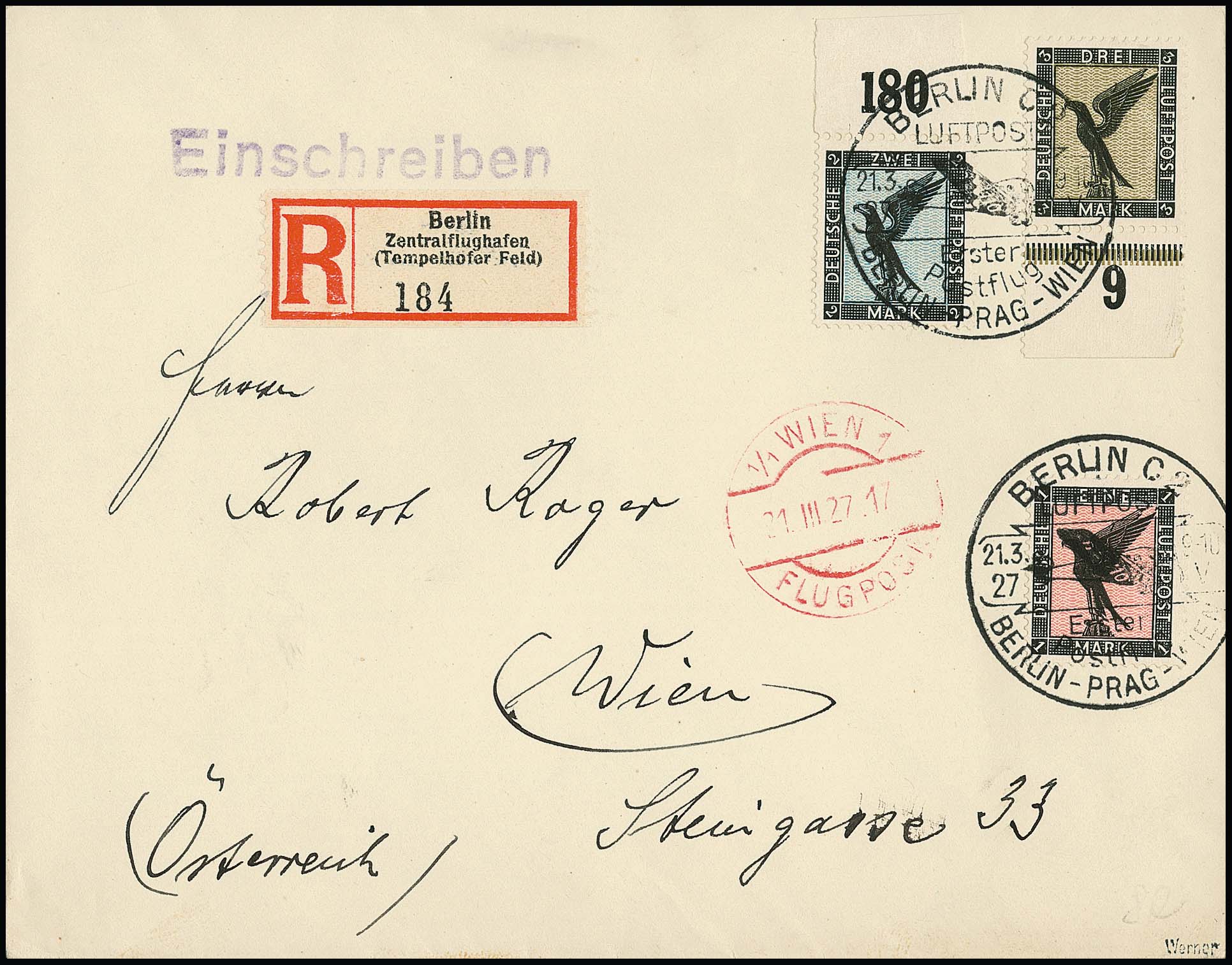1, 2 (vom Oberrand) und 3 RM Flugpost auf Auslands-R-Lupo-Brief ab Berlin, 1. Postflug Berlin-Prag-Wien 1927