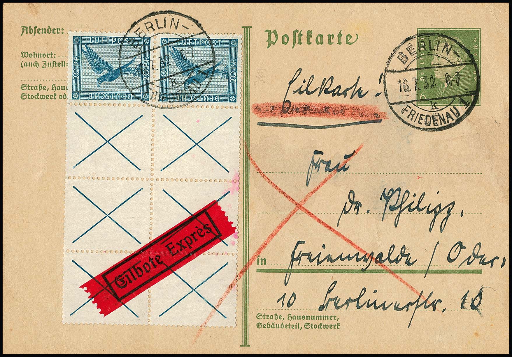 20 Pfg. Flugpost, Zusammendruck mit drei Andreaskreuzen per zwei auf 6 Pfg.-Ganzsachenkarte als Expreßkarte ab Berlin, Mi. 480,-
