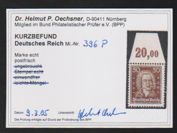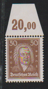 50 Pfg. Bach als postfrisches Plattendruck-Oberrandstück (in der Zhg. vorgefaltet), Fotoexp. Oechsner. Mi. 400,-