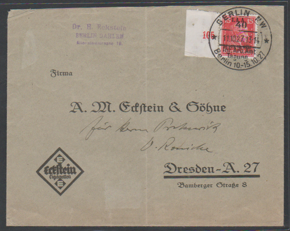 15 Pfg. IAA, linkes Randstück als portoger. EF auf Brief von Berlin (SST, Couvert Mittelfalte ausserhalb) nach Dresden, Mi. 550,- +