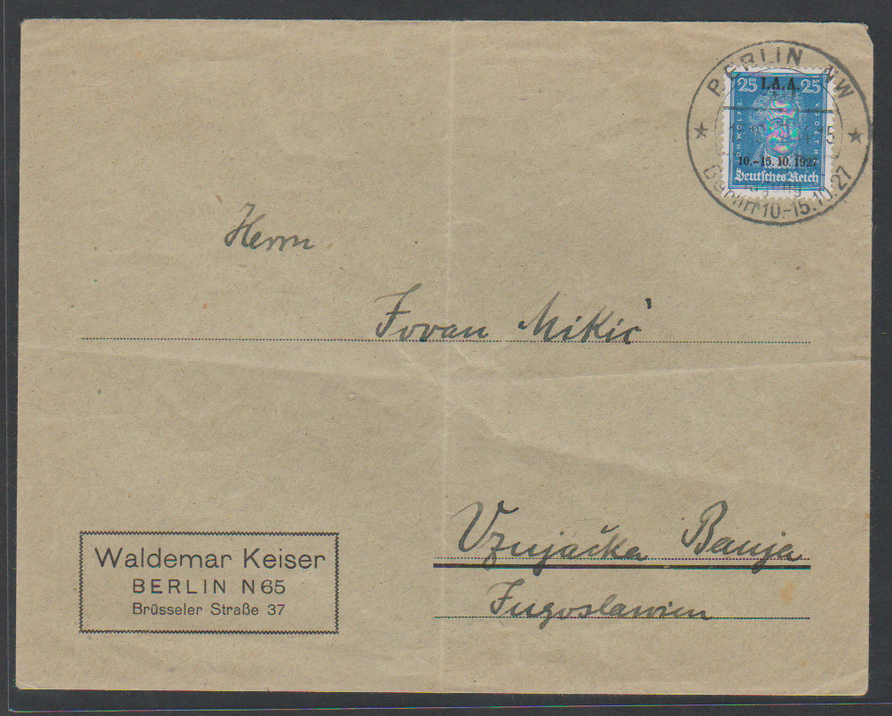 25 Pfg. IAA als portoger. EF auf Auslandsbrief (Faltspuren ausserhalb) von Berlin 1927 nach Jugoslawien, Mi. 600,-