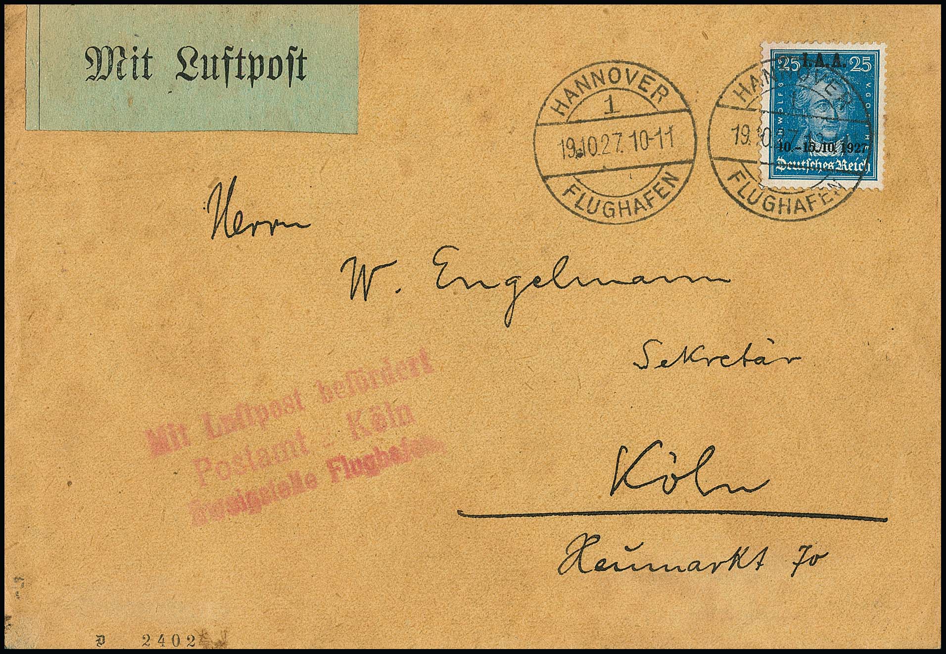 25 Pfg. I.A.A. als seltene Einzelfrankatur auf Lupo-Brief von Hannover nach Köln, leichte Gebrauchsspuren, Mi. 600,-