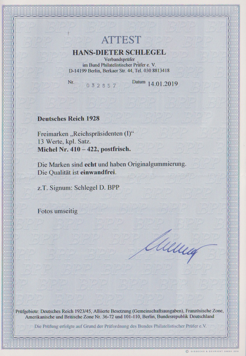 Reichspräsidenten tadellos postfrisch, Attest D. Schlegel. Mi. 1100,-
