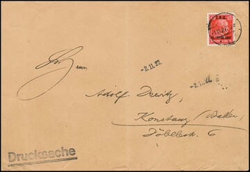 15 Pfg. I.A.A. als seltene Einzelfrankatur auf Drucksache der 4. Gewichtsstufe (Gebrauchserhaltung wie Falte ausserhalb und Knitter)