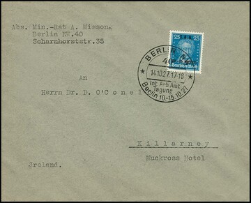 25 Pfg. IAA als portoger. Einzelfrankatur auf Auslandsbrief von Berlin (mit entspr. SST) nach Irland, Fotoexp. D. Schlegel. Mi. 600,-
