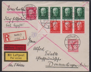 Hindenburg-Spende, Heftchenblatt 56 ohne Rand, nebst zweimal 10 Pfg., auf Lupo-Expreß-R-Brief aus Berlin 1927