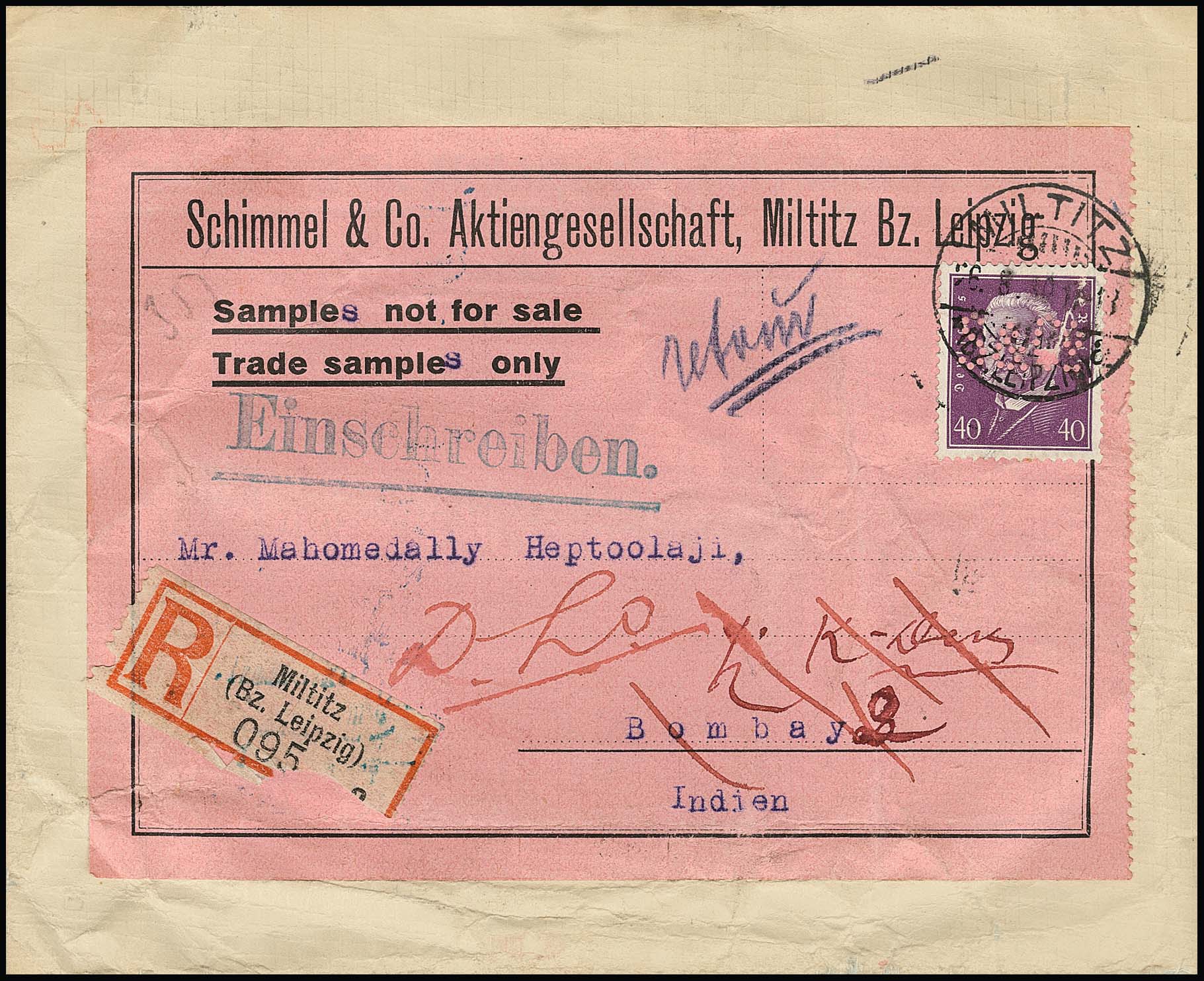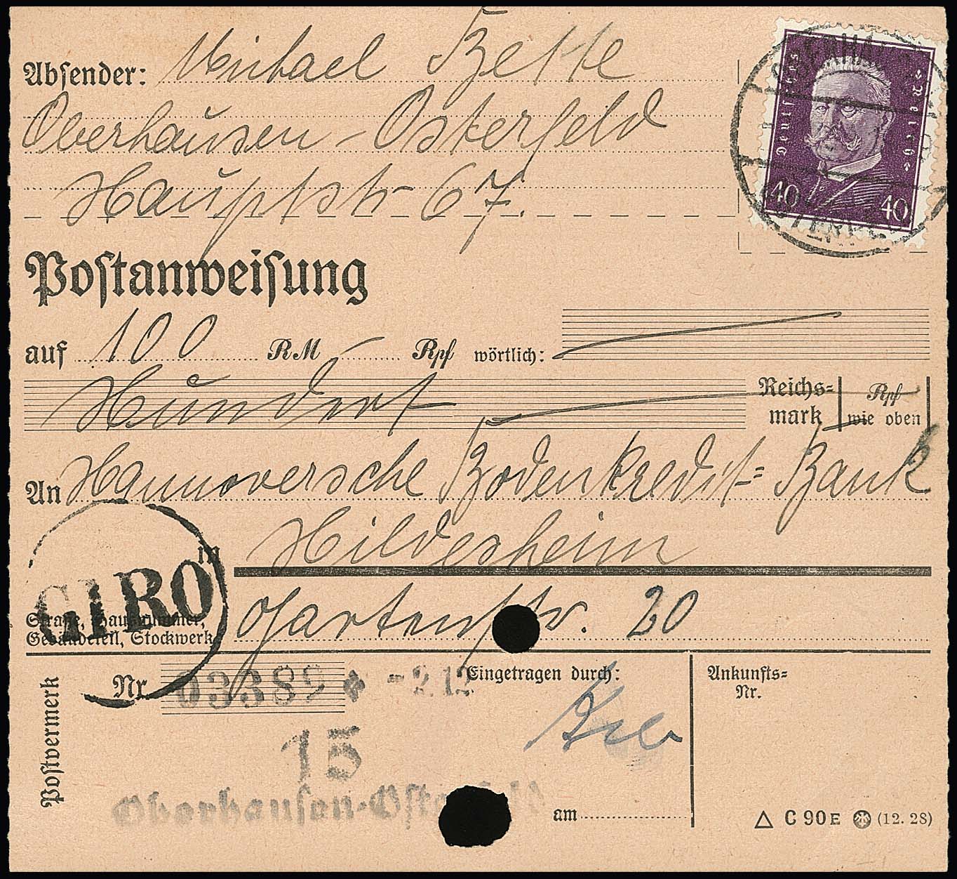40 Pfg. Hindenburg, zwei seltene Einzelfrankaturen: auf Inlands-Postanweisung, sowie auf Übersee-R-Brief "Muster ohne Wert" nach Indien (kl. gebrauchsbedingte Mängel), sehr seltene Variante