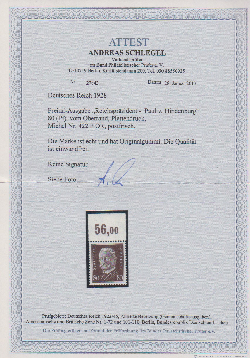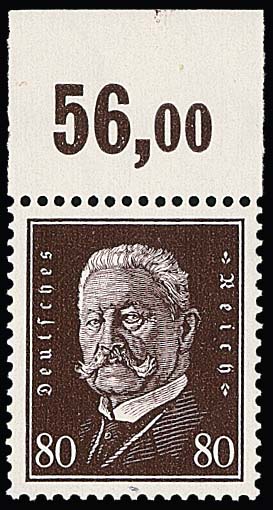 80 Pfg. Hindenburg als ungefaltetes postfrisches Plattendruck-Oberrandstück, Attest A. Schlegel. Mi. 750,-