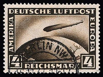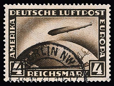 4 RM Zeppelin, seltener Plattenfehler "weißer Punkt links am K von MARK" als gestempeltes Bedarfsstück, Michel ohne Preis, sign. D. Schlegel