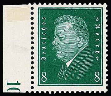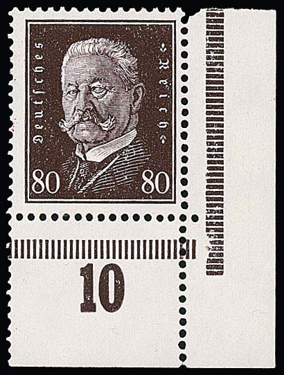80 Pfg. Hindenburg, postfrische rechte untere Bogenecke (Platte), Mi. Normalmarke 340,- +