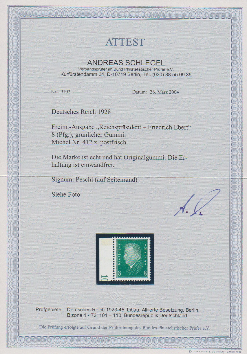 8 Pfg. Ebert mit grünlichem Gummi postfrisch vom linken Bogenrand (dort Falzrest), sign. Peschl und Attest A. Schlegel. Mi. 360,-