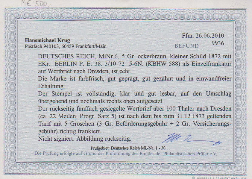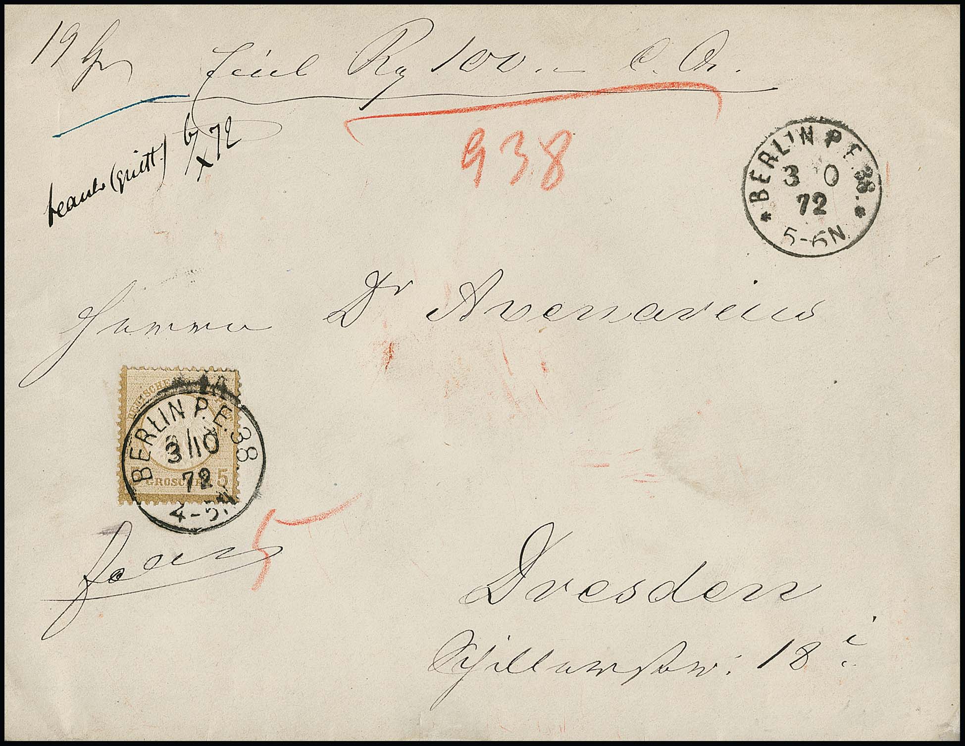 5 Gr. ockerbraun einzeln auf Kabinett-Wertcouvert mit K1 "Berlin P.E. 38" 1872, Fotoexp. Krug