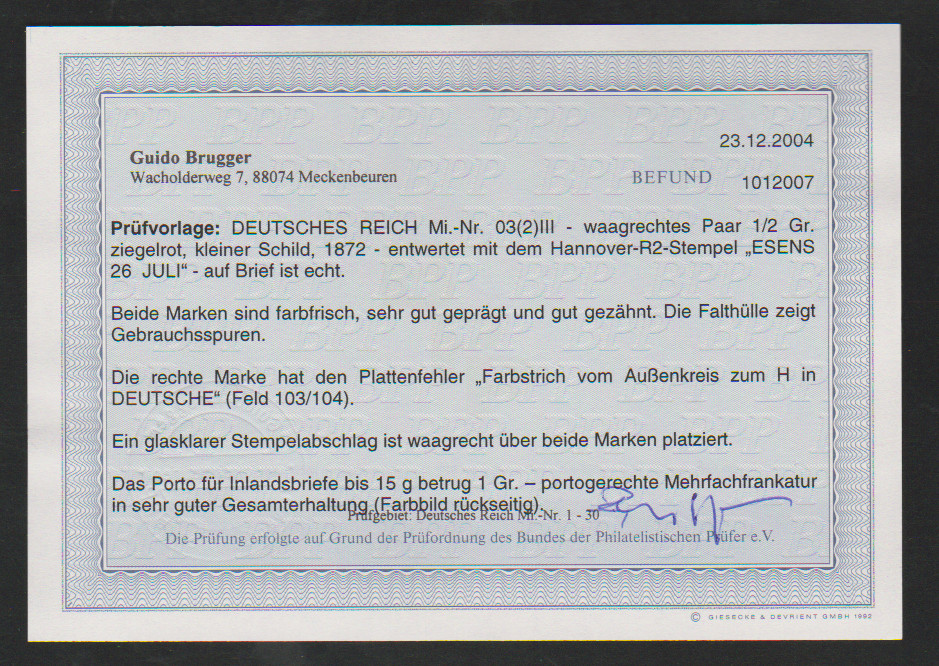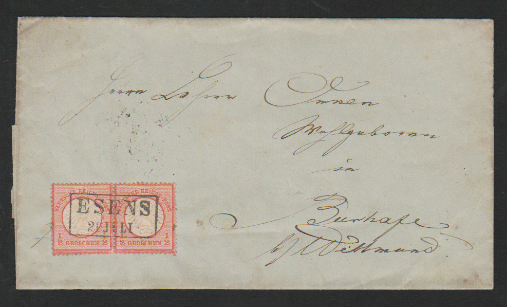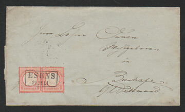 1/2 Gr. ziegelrot, Prachtpaar, rechte Marke mit Plattenfehler III, auf Brief mit nachverw. Ra2 "Esens", Fotoexp. Brugger