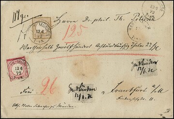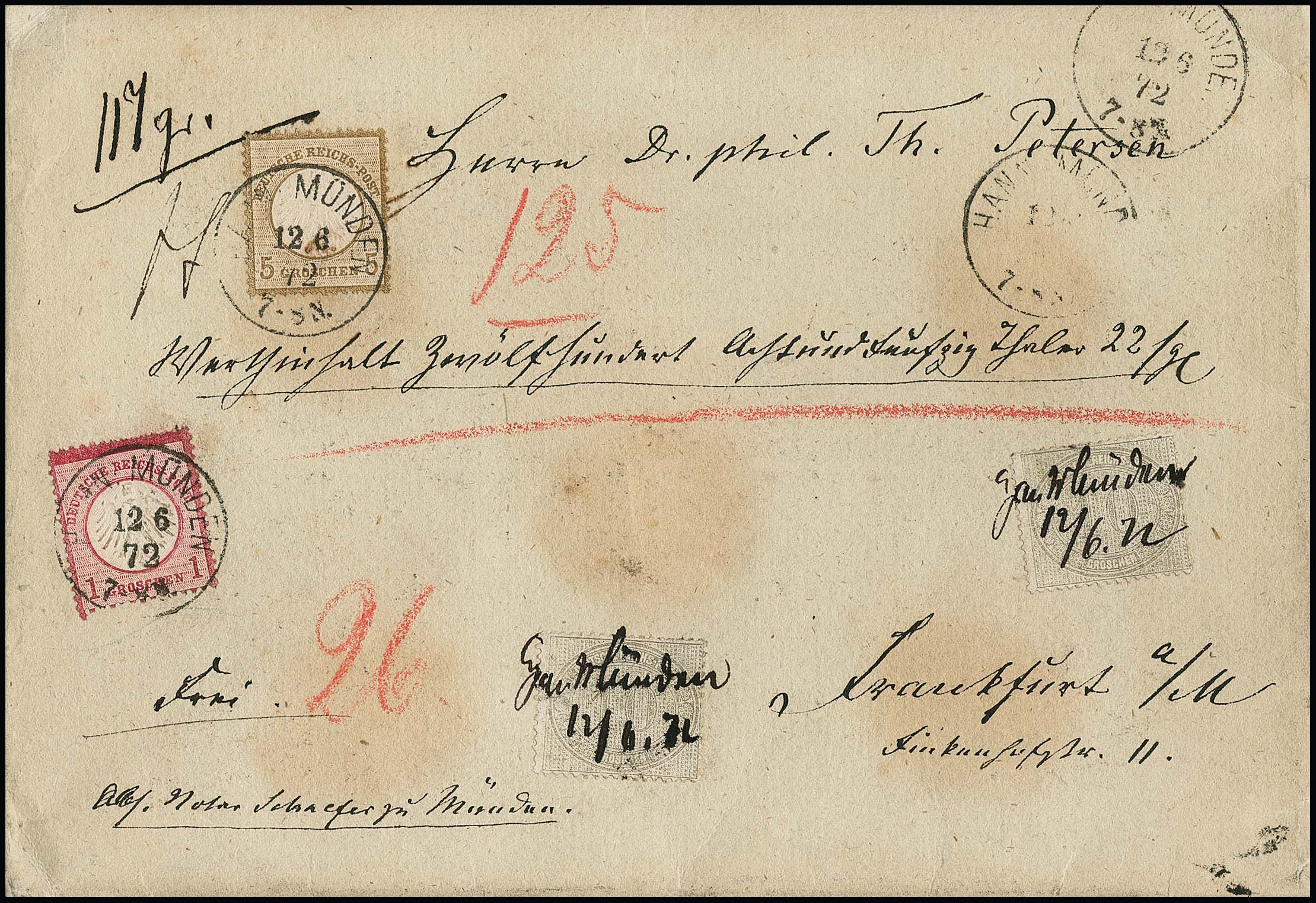 1 Gr. karmin, 5 Gr. gelbbraun (kl. Fleck) und zweimal 10 Gr. grau auf Wertbrief aus Hann.-Münden nach Frankfurt a.M.